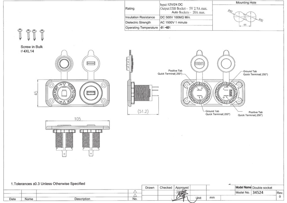 Zásuvka do panelu dvojitá 12/24V - 1x zapalovač 20A + 2x USB 2,1A